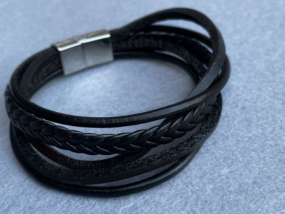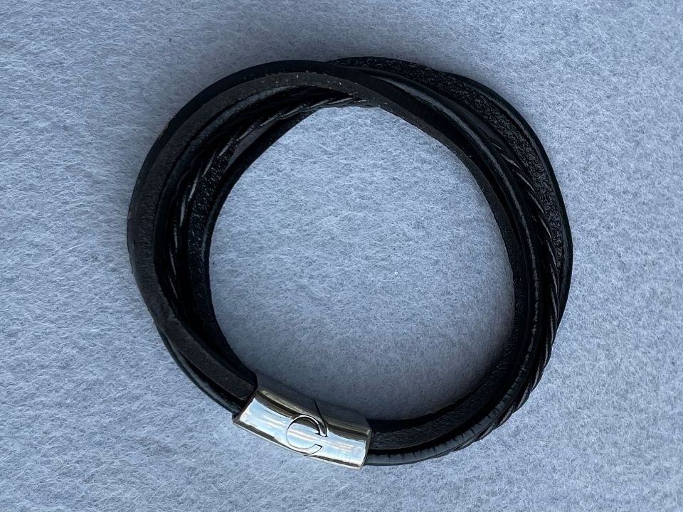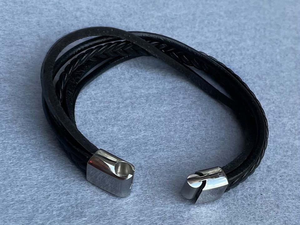 Шкіряний браслет зі сталевою застібкою з нержавіючої сталі. Розмір: 21см, ідеально підійде на зап'ястя від 16-19см. Розмір шкіри: ~20мм. Колір чорний. Матеріали: шкіра, ювелірна сталь Модель підійде як чоловікам, так і жінкам.