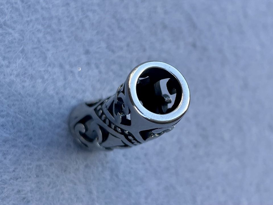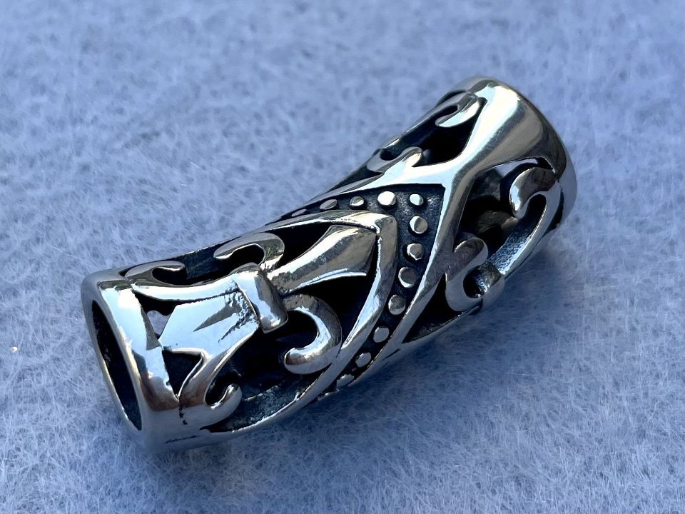 Бусина-протяжка з нержавіючої сталі для виготовлення біжутерії. Використовуються для шкіряних шнурів, ланцюгів, парокорду. Розмір: 14 * 35мм, отвір: 9мм. Колір-сталь. Ціна за 1шт.