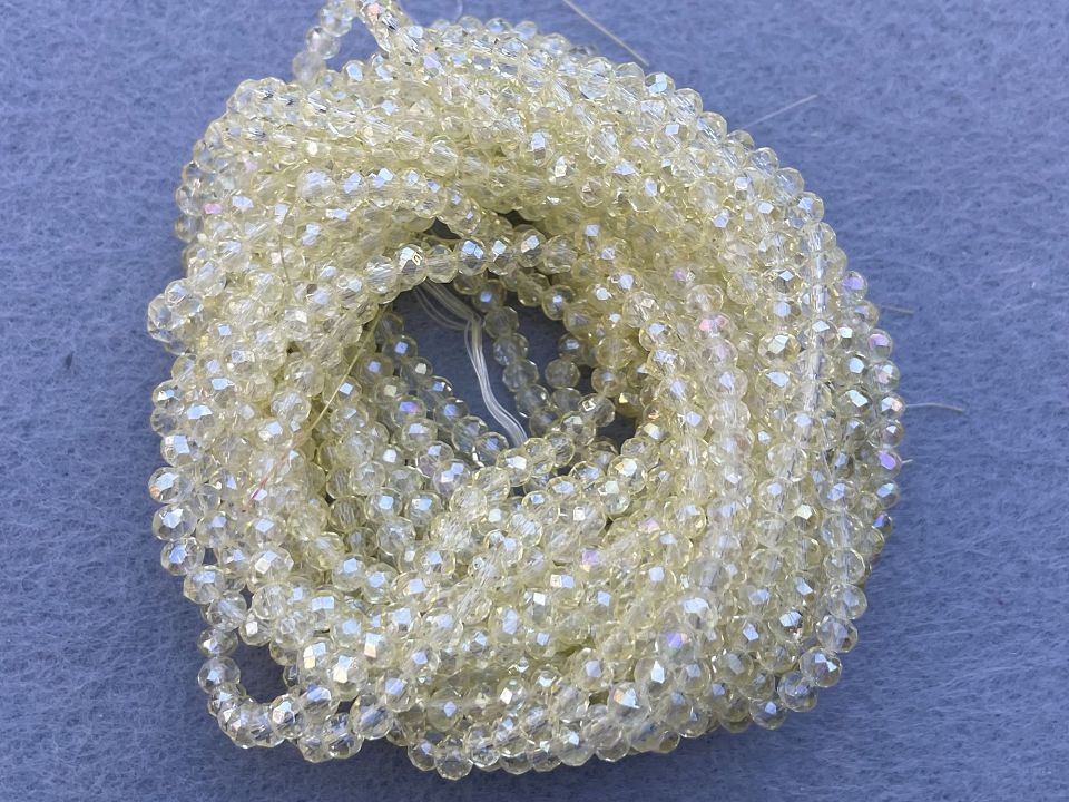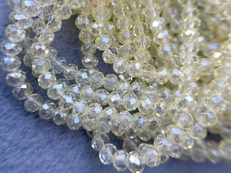 Кришталеві намистини, грановані. Розмір: 4*4,5мм, отвір: 1мм. Форма: рондель, сфера. У нитці: 143+-5шт. Ціна за 1 нитку. Колір жовтий з переливом.