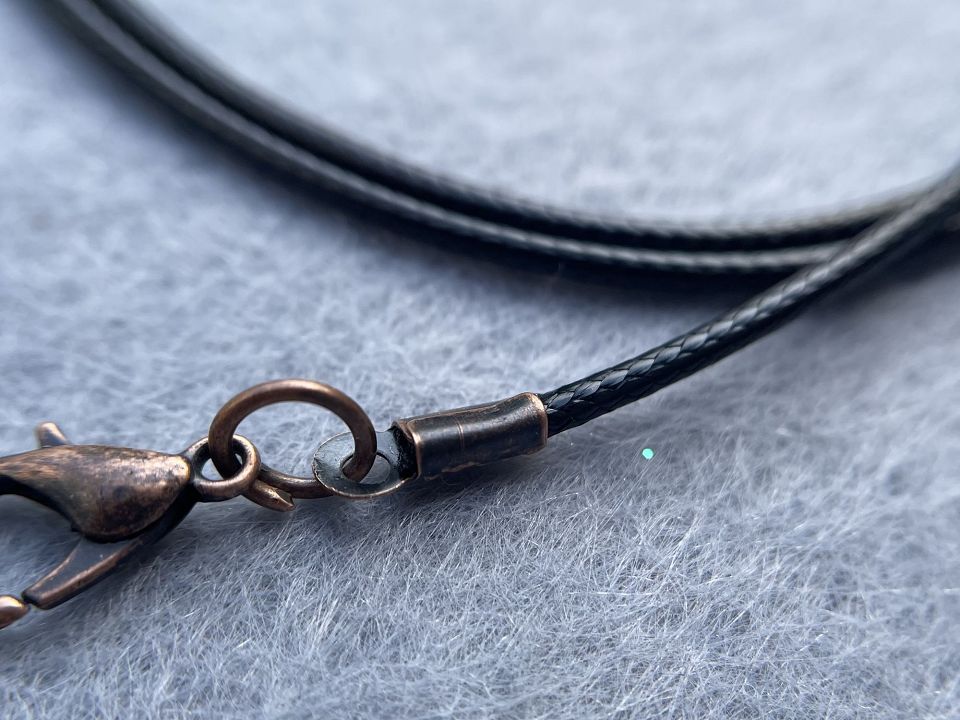 Шнурок на шию для кулонів та підвісок. Зроблений із просоченого вощеного шнура. Діаметр: 2-2,5 мм. Розмір шнурка: 52-57см. Колір чорний. Ціна за 100 шт.