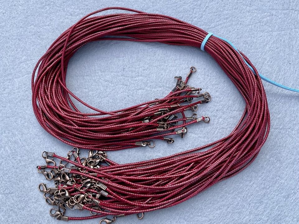 Шнурок на шию для кулонів та підвісок. Зроблений із просоченого вощеного шнура. Діаметр: 2-2,5 мм. Розмір шнурка: 52-57см. Колір-бордовий. Ціна за 50 шт.