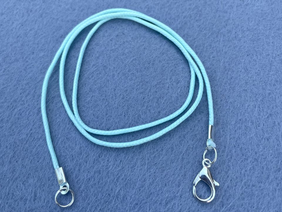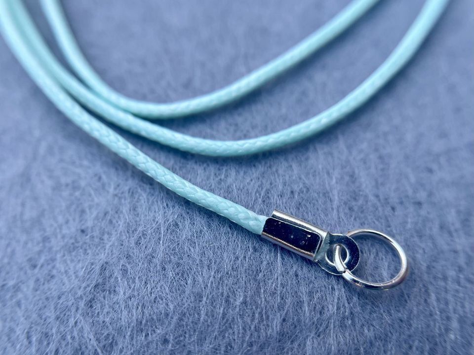 Шнурок на шию для кулонів та підвісок. Зроблений із просоченого вощеного шнура. Діаметр: 2-2,5 мм. Розмір шнурка: 52-55см. Колір-м'ятний. Ціна за 100 шт.