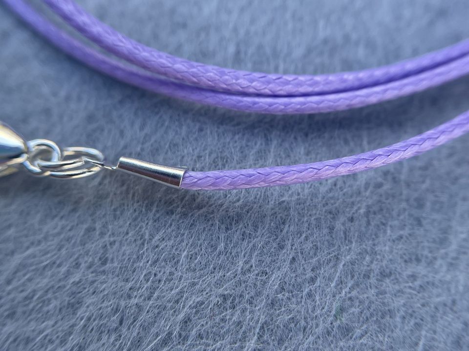 Шнурок на шию для кулонів та підвісок. Зроблений із просоченого вощеного шнура. Діаметр: 2-2,5 мм. Розмір шнурка: 52-55см. Колір-бузковий. Ціна за 50 шт.