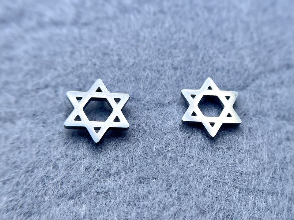 Сережки "Зірка Давида". Виготовлені із нержавіючої сталі. Розмір: 9*10мм. У комплекті йдуть силіконові заглушки. Ціна за 1 пару