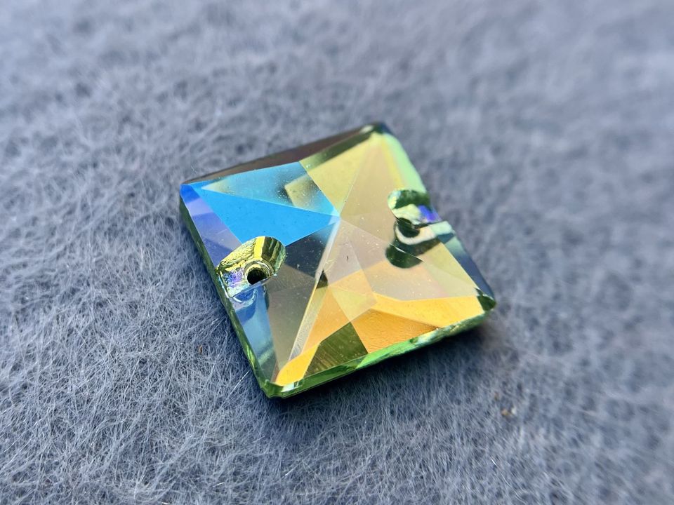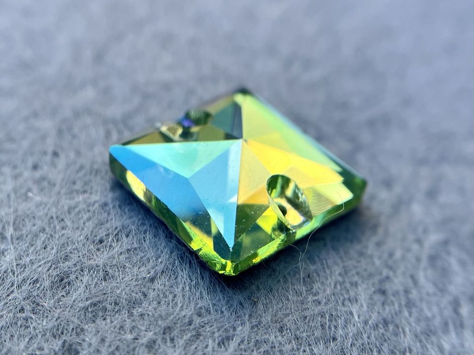 Пришивні скляні камінці. Виробництво: Чехія. Розмір: 14мм, форма-квадрат. Колір - Peridot AB. Ціна за планшетку – 28шт.