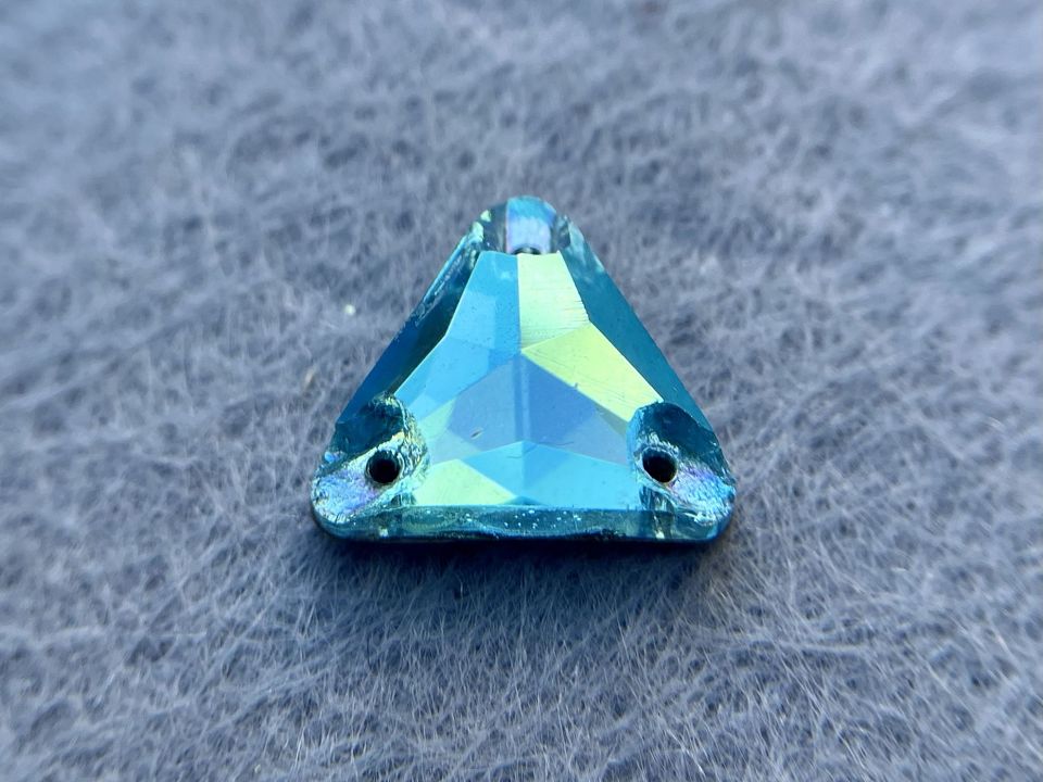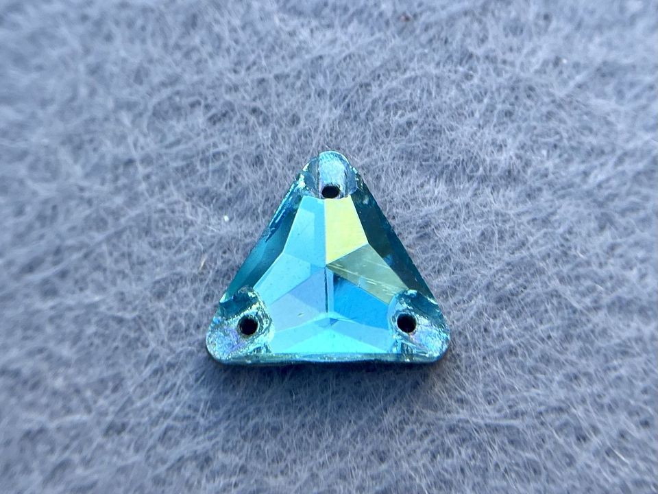 Пришивні скляні камінці. Виробництво: Чехія. Розмір: 14мм, форма-трикутник. Колір - Aquamarine AB. Ціна за планшетку – 30шт.