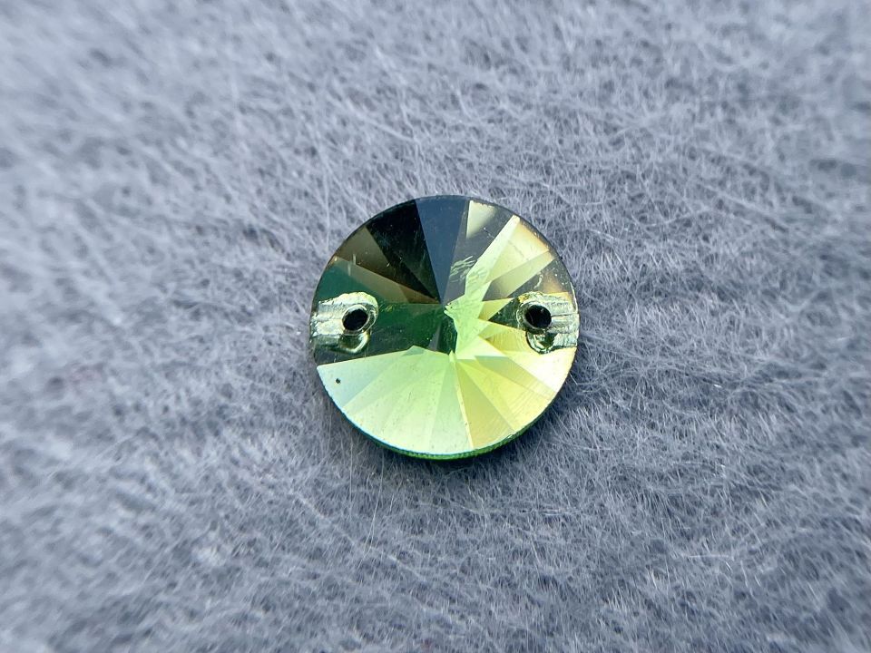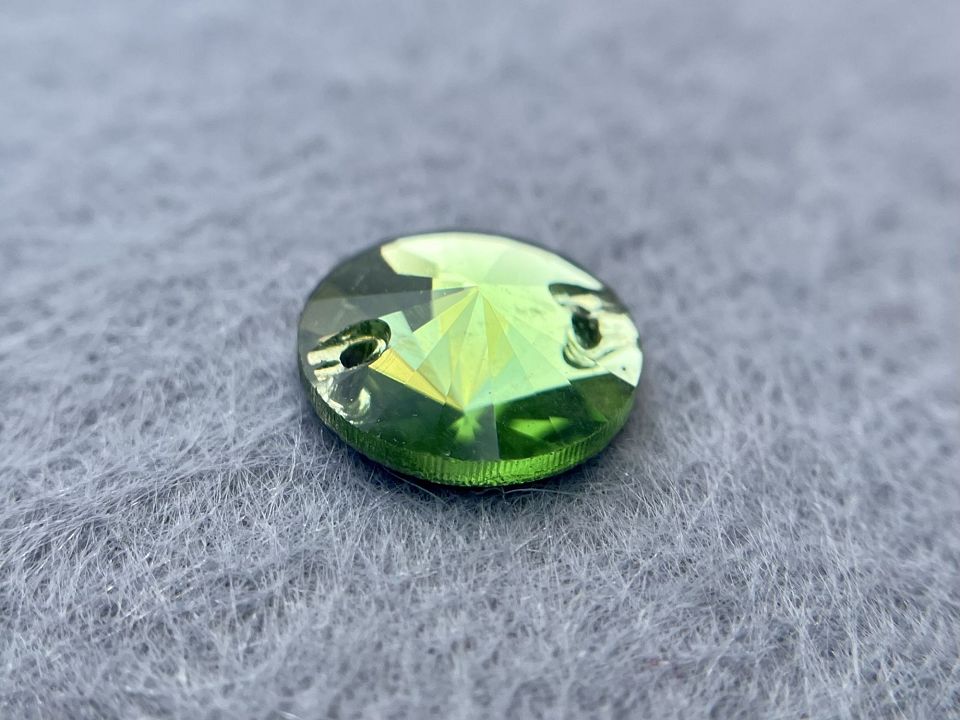 Пришивні скляні камінці. Виробництво: Чехія. Розмір: 12мм, форма-коло. Колір - Peridot. Ціна за планшетку – 35шт.