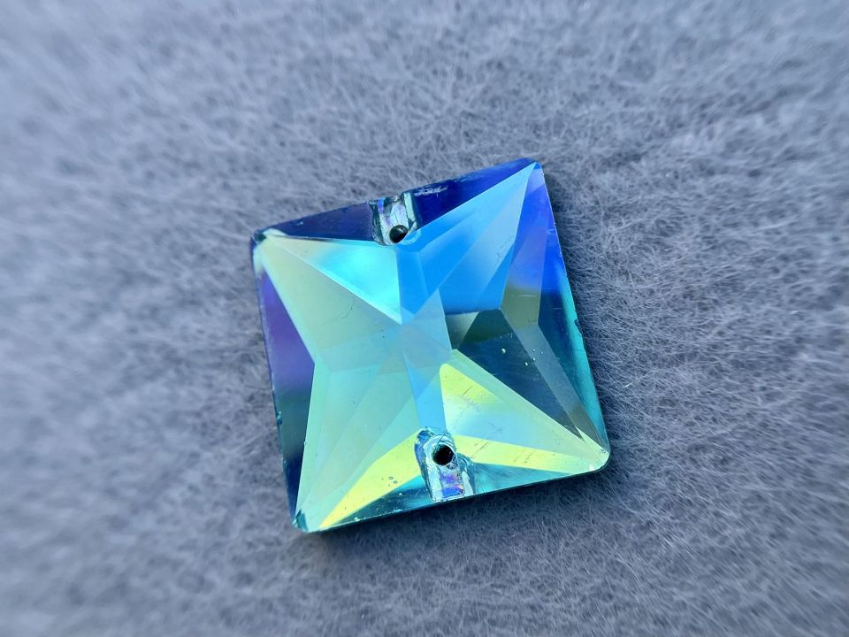 Пришивні скляні камінці. Виробництво: Чехія. Розмір: 22мм, квадрат. Колір - Aquamarine AB. Ціна за планшетку – 15шт.