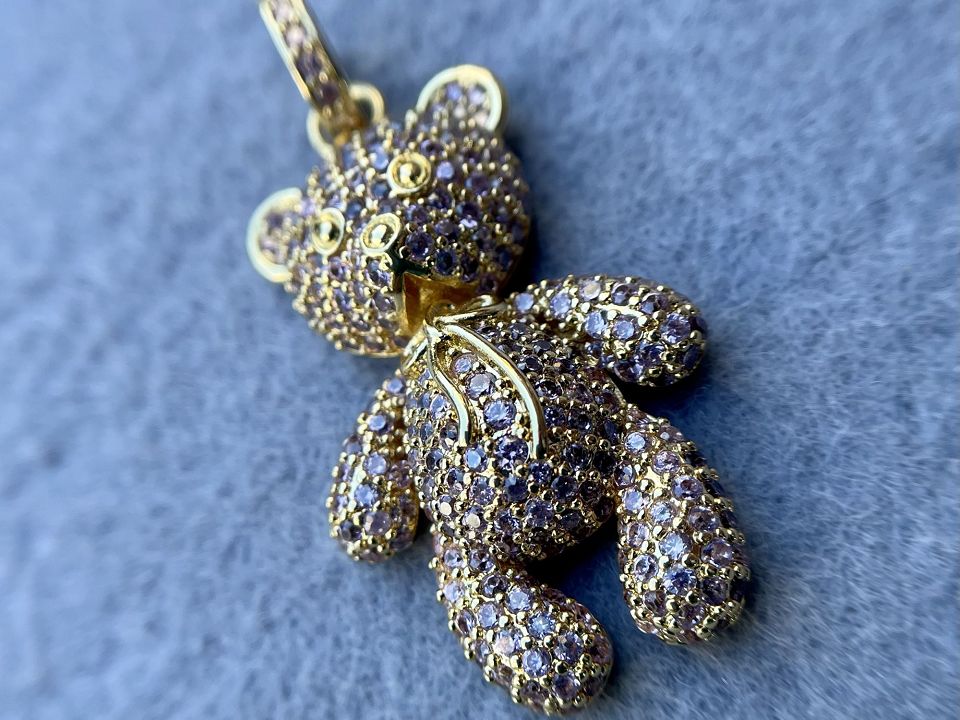 Кулон "Ведмедик"-Мілано класу люкс (MILANO LUX), з інкрустацією цирконієм із латуні з родієвим покриттям. Колір-золото, стрази-рожеві. Розміри 24*47мм. Ціна за 1 штуку. Ідеально підійде для ланцюгів на шию.