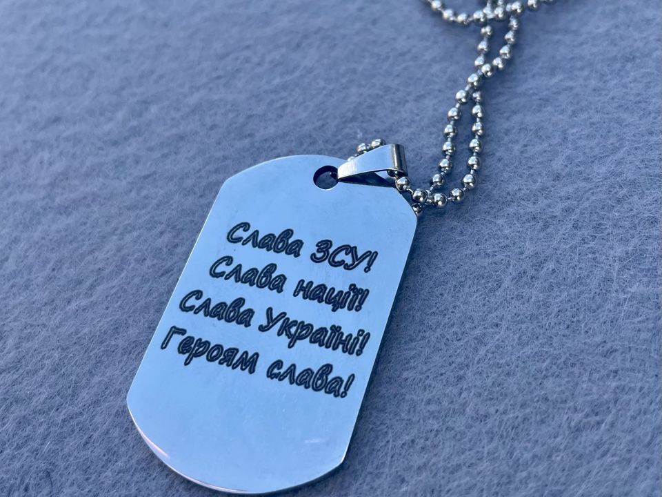 Армійський жетон-двосторонній, з нержавіючої сталі з гравіюванням. Іде на ланцюжку із нержавіючої сталі-60см. Розмір: 4*2,5см, товщина: 1,5мм. Колір-сталь. Ціна за шт.