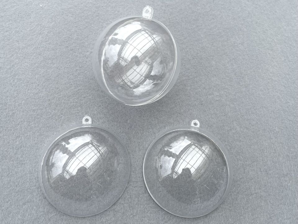 Роз'ємні пластикові кулі. Діаметр: 8см. Куля має гладку поверхню і складається з двох розбірних частин, з'єднавши їх отримуєте цілісну кулю. Має кільце для підвішування.
