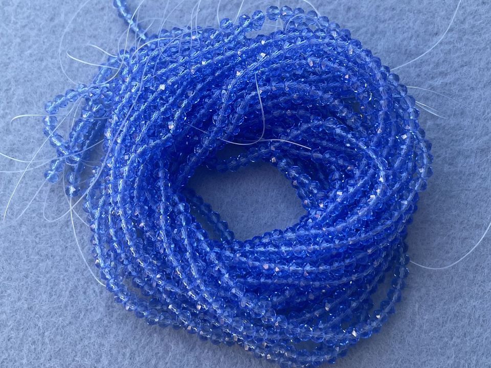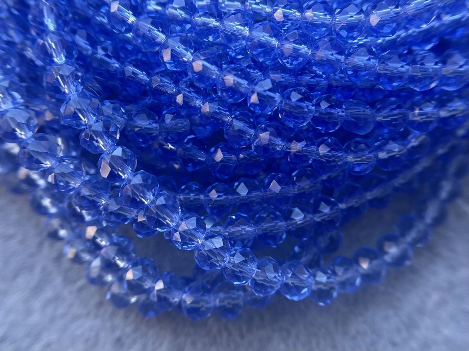 Кришталеві намистини, грановані. Розмір: 3*3,5мм, отвір: 1 мм. Форма: рондель, сфера. У нитці: 145+-5шт. Ціна за 1 нитку. Колір небесний.