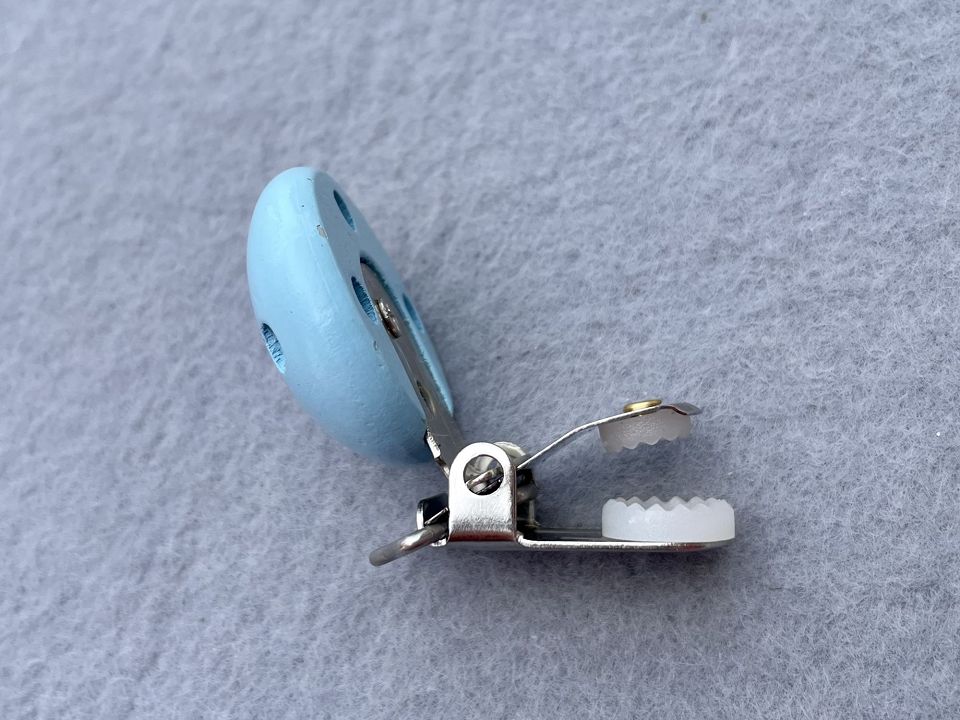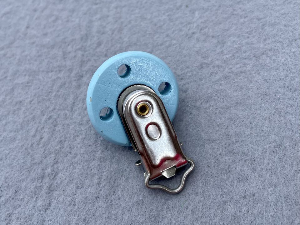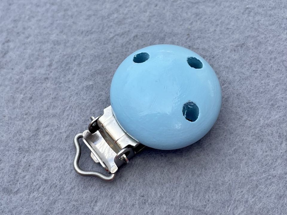 Затискачі-кліпси для тримачів пустушок, гризунків, підвісок. Механізм: метал та пластик. Декор - дерев'яна "гудзик" діаметром 30 мм. Розмір всього затиску 30х45 мм. Ціна за 5шт (можна різних кольорів)