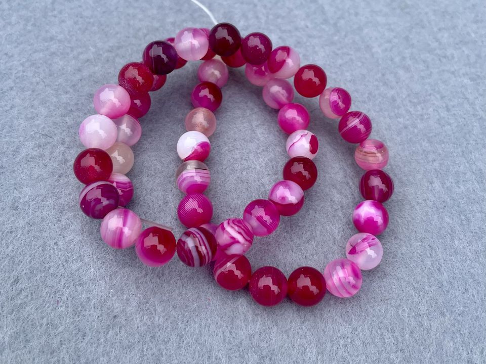 Агат-пресований, гладкий. Розмір намистини: 8мм. Колір малиновий. Кількість намистин на нитці: 48 (+-2шт). Отвір каменю: 1мм. Ціна за нитку (без замку). Довжина нитки: ~38 см