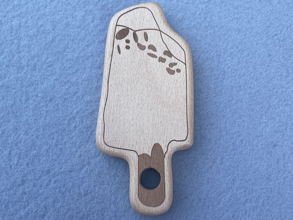 Гризунок дерев'яний "Морозиво". Дерев'яний, фігурний гризунок для слінгбусу. Аксесуар виготовлений із натуральної деревини (бук), якісно оброблений, не покритий лаком. Такий гризунок повністю безпечний для малюка, він не залишить скалку. Розмір: 4,5 * 9,5см.
