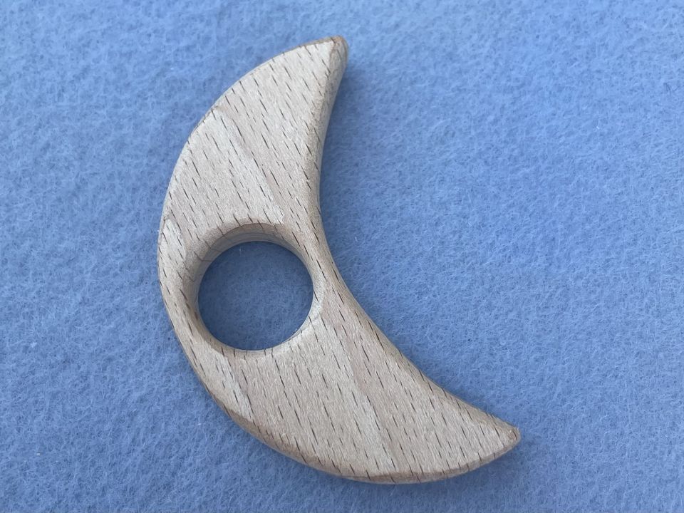 Гризунок дерев'яний "Місяць". Дерев'яний, фігурний гризунок для слінгбусу. Аксесуар виготовлений із натуральної деревини (бук), якісно оброблений, не покритий лаком. Такий гризунок повністю безпечний для малюка, він не залишить скалку. Розмір: 4*7,5см.