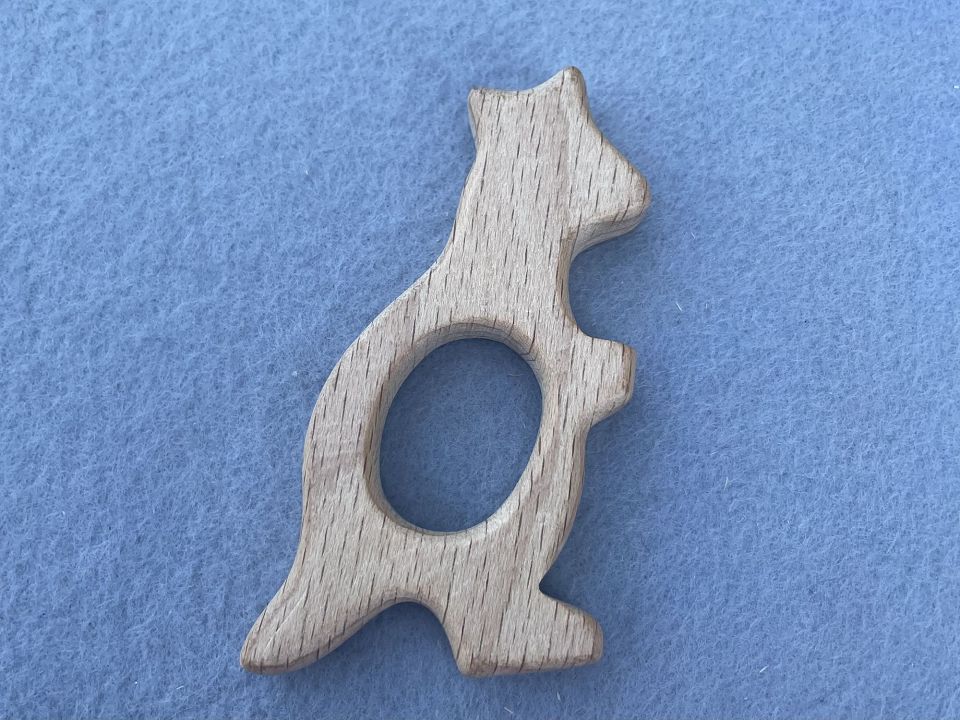 Гризунок дерев'яний "Кенгуру". Дерев'яний, фігурний гризунок для слінгбусу. Аксесуар виготовлений із натуральної деревини (бук), якісно оброблений, не покритий лаком. Такий гризунок повністю безпечний для малюка, він не залишить скалку. Розмір: 7*5см.