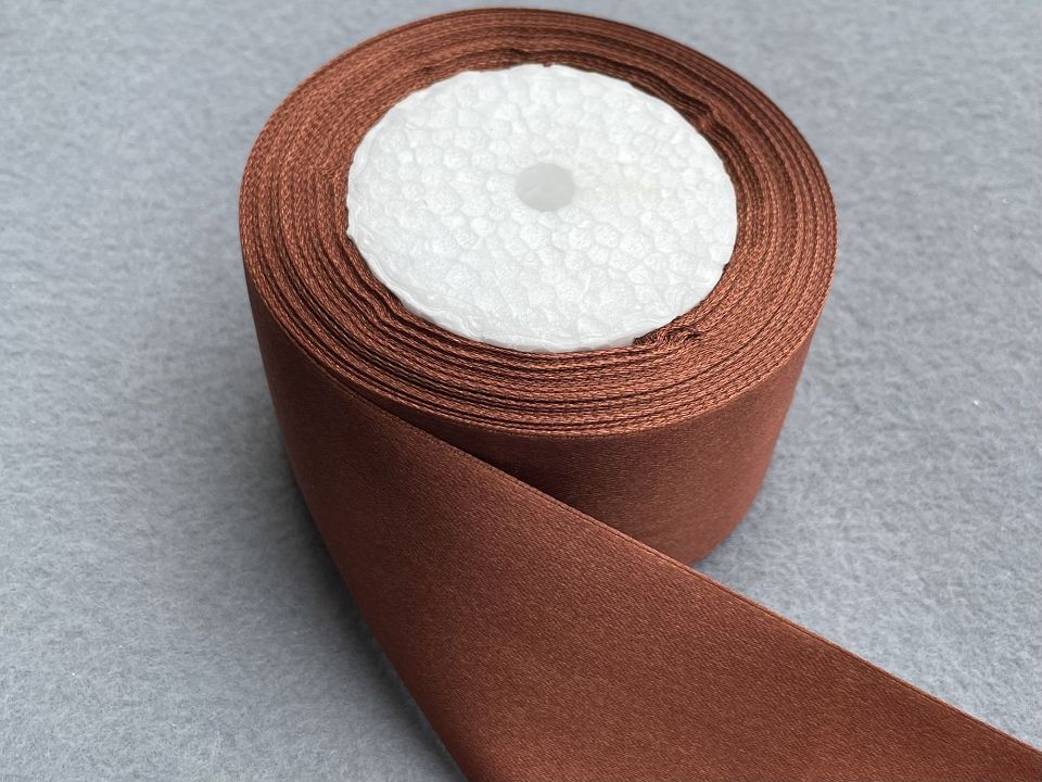 Стрічка атласна-ширина 5 см. У мотку ~23 метри. Колір-коричневий. Застосовують для прикраси, обробки одягу, вишивання стрічками, плетіння стрічками і т.д. Ціна вказана за 1 моток. Виробництво – Китай.