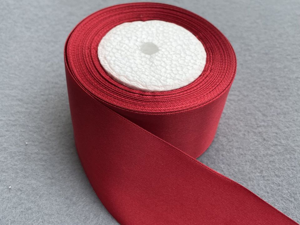 Стрічка атласна-ширина 5 см. У мотку ~23 метри. Колір-темно червоний. Застосовують для прикраси, обробки одягу, вишивання стрічками, плетіння стрічками і т.д. Ціна вказана за 1 моток. Виробництво – Китай.
