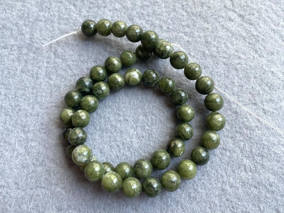 Нефрит-натуральний, гладкий. Розмір намистини: 8мм. Кількість намистин на нитці: 48 (+-2шт). Отвір каменю: 1мм. Ціна за нитку (без замку). Довжина нитки: 38см