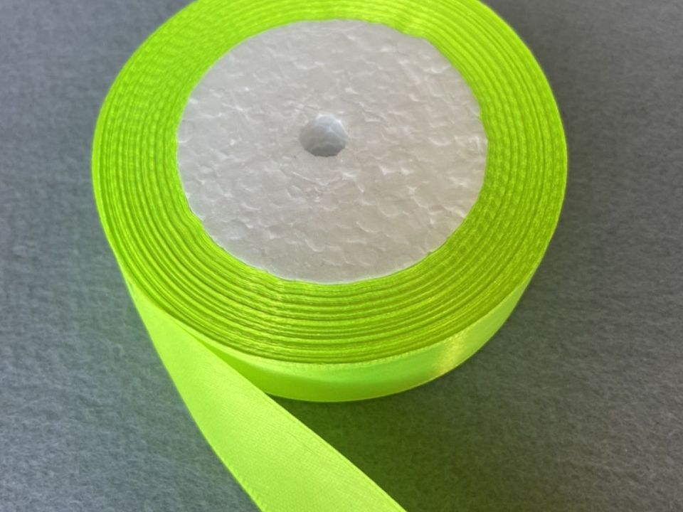 Стрічка атласна-ширина 2.5 см. У мотку ~23 метри. Колір-кислотно салатовий. Застосовують для прикраси, оздоблення одягу, вишивання стрічками, плетіння стрічками тощо. Ціна вказана за 1 моток. Виробництво – Китай.