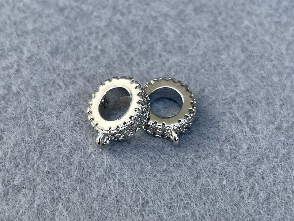 Бусіна-бейл інкрустована Кубічним цирконієм (також називаються бейли з фіанітами) Покриття родій Колір-сталь. Розмір: 11 * 10мм, ширина-3мм, отвір-5мм. Кільце не роз'ємне. Ціна за 1шт. Бейли використовуються для кріплення підвісок на браслети або кольє.