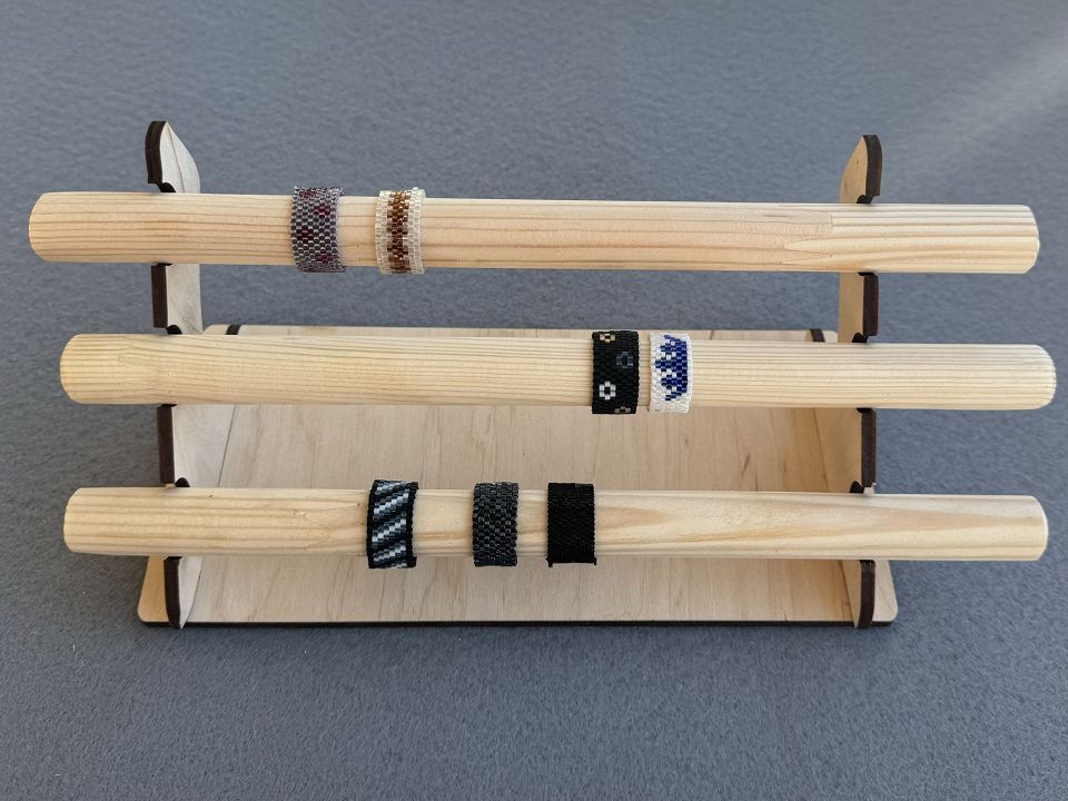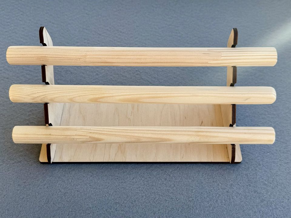 Дерев'яна підставка для кілець. Має 3 яруси. Розмір у розкладеному вигляді 10*10*25 см. Трубка діаметром -1,6-1,7 см, довжина – 24,5 см.