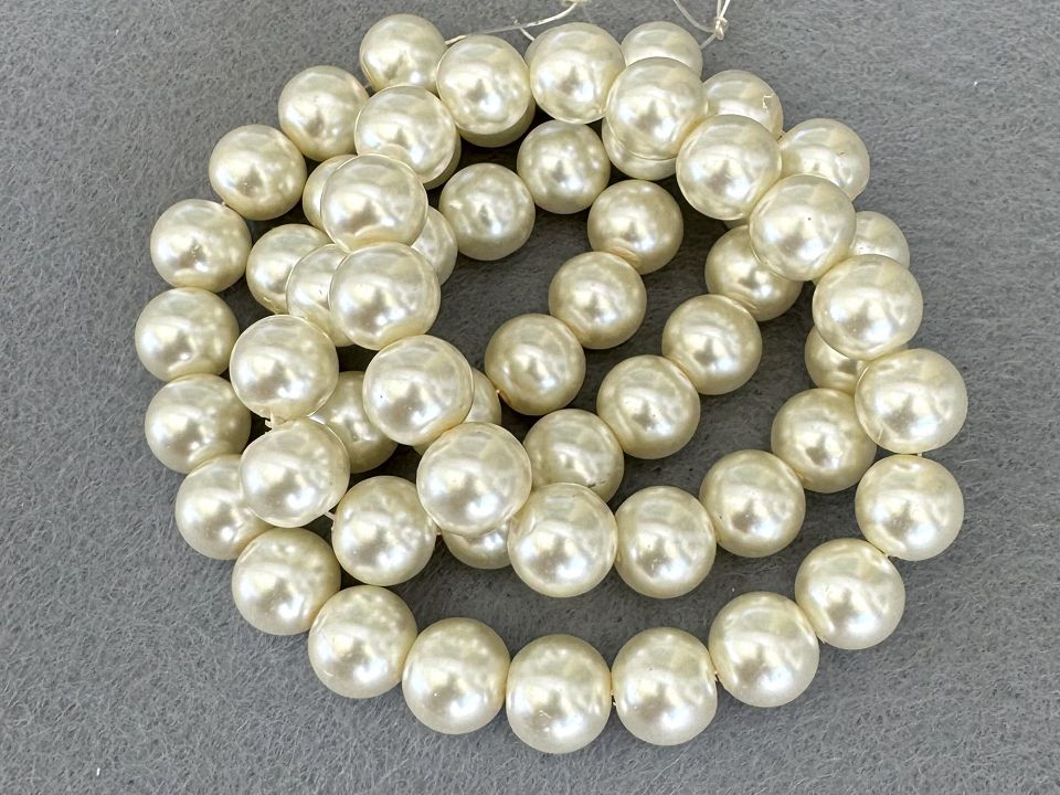 Перли керамічні. Розмір: 14 мм, отвір: 2 мм; Кількість на нитці – 61 ± 2 намистин. Колір – молочний Ціна за нитку.