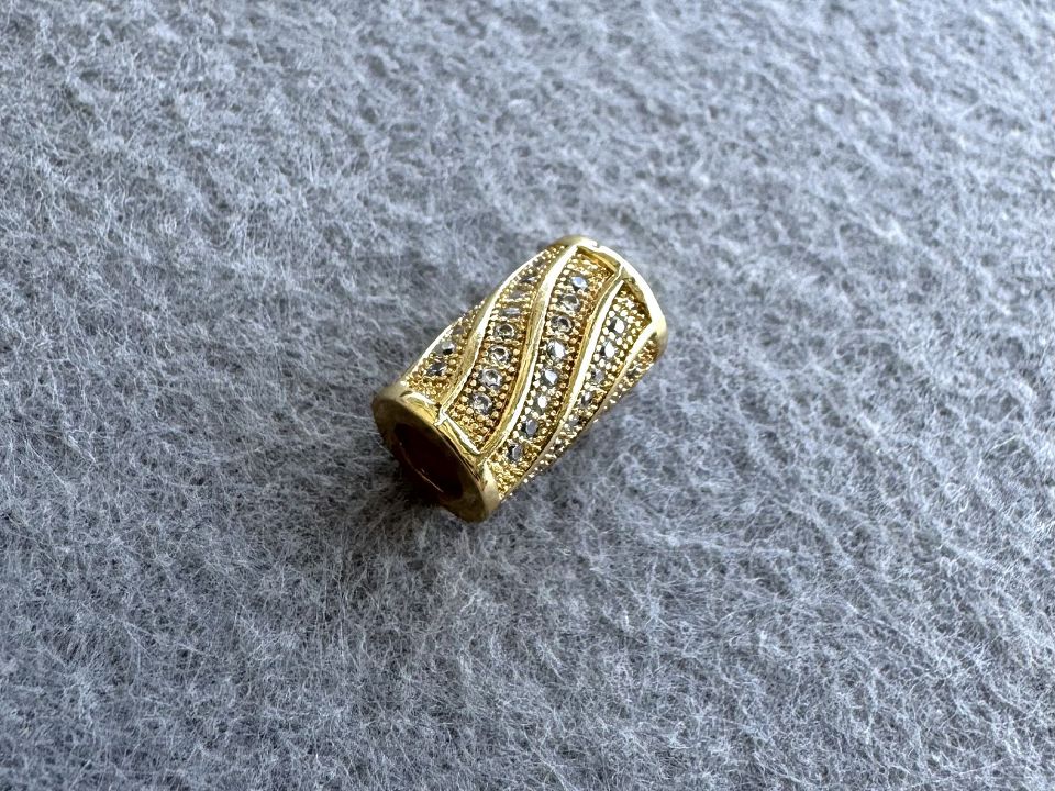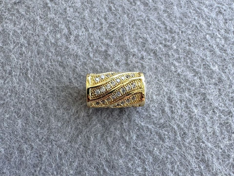 Бусина інкрустована Кубічним цирконієм (також називаються намистинами з фіанітами). Покриття родій. Колір – золото. Розмір: 13*8 мм, отвір - 4 мм. Ціна за 1 шт