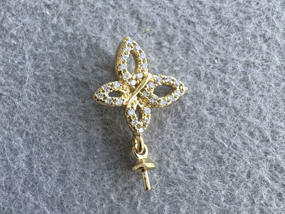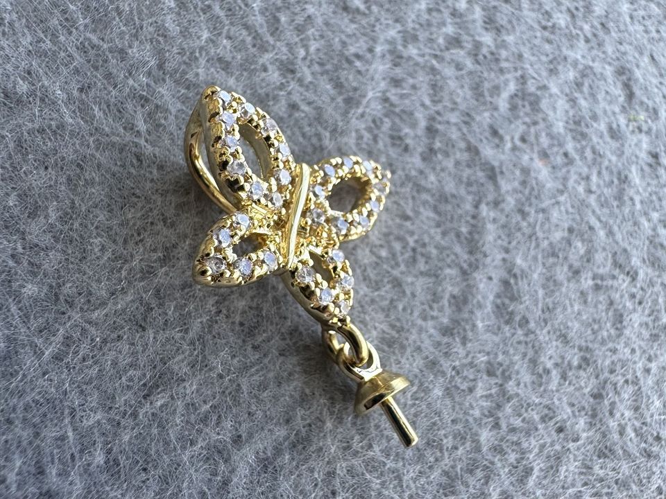 Підвіска інкрустована кубічним цирконієм зі штифтом для приклеювання перлин. Покриття родій Розмір: 17*19 мм + штифт 8 мм. Штифт: 3,5 мм, діаметр: 1 мм. Колір – золото, ціна за 1 шт.