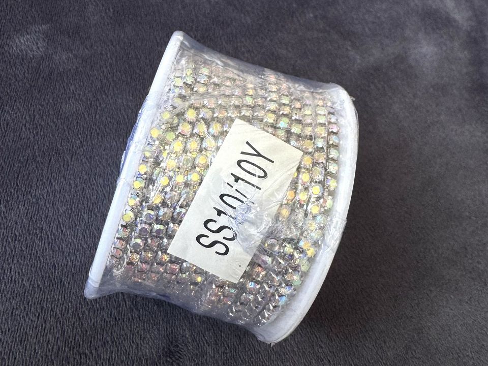 Стразова стрічка – ss 10 (2,5 мм). Колір каменю - білий з переливом (crystal AB) у срібній оправі. Ціна за котушку – 10 ярдів