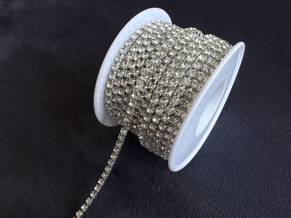 Стразова стрічка – ss 12 (3 мм). Колір каменю - білий (crystal) у срібній оправі. Ціна за котушку – 10 ярдів