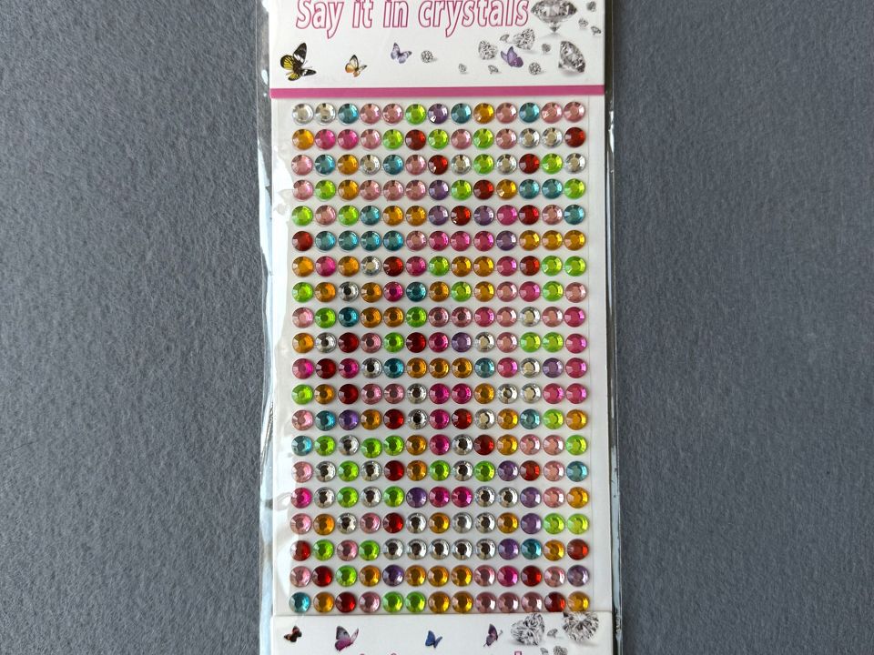 Стрази на клейовій основі. Використовуються для декорування листівок, а також підходять на будь-яку тверду поверхню: пенали, зошити, кружки ... Розмір страз - 6мм Ціна за 1 шт : 20 смужок - 8,5 см.
