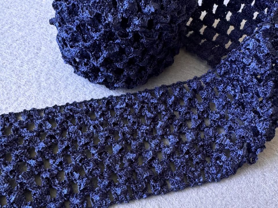 Ажурна гумка дитяча. Ширина 6 см. Ціна за моток – 25 метрів. Використовується для дитячих пов'язок на голову та одяг. Колір - темно синій.