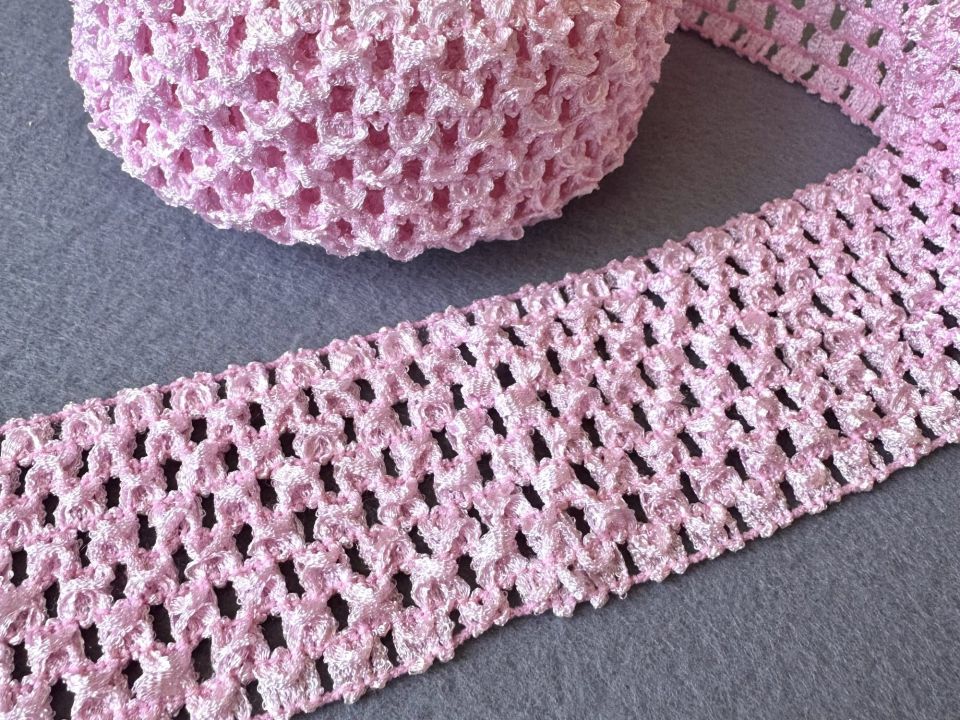 Ажурна гумка дитяча. Ширина 6 см. Ціна за моток – 25 метрів. Використовується для дитячих пов'язок на голову та одяг. Колір - ніжно рожевий.