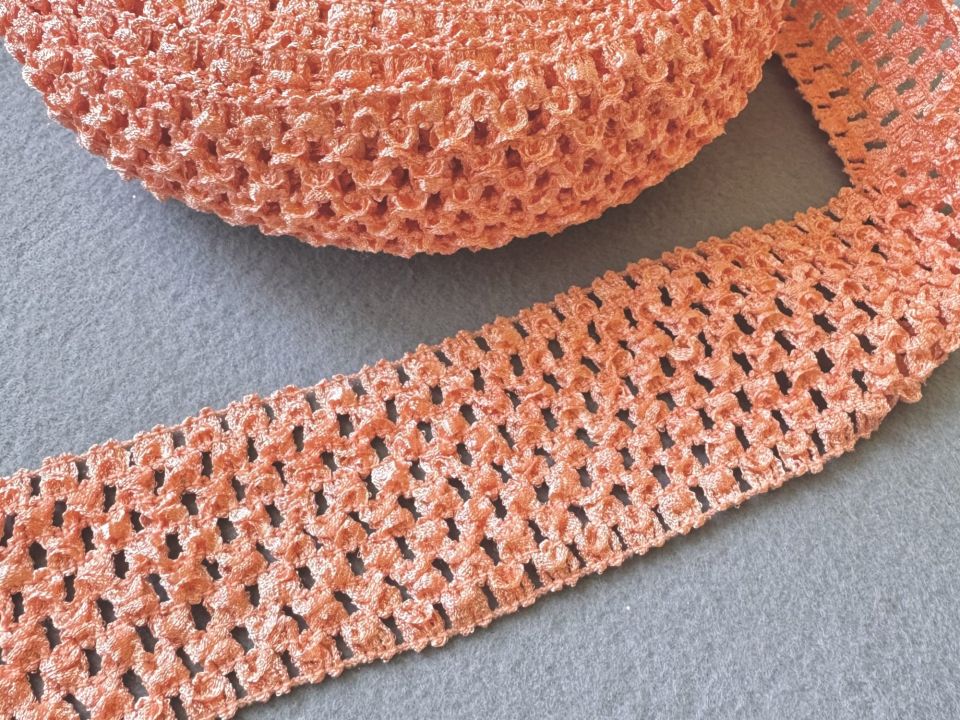Ажурна гумка дитяча. Ширина 6 см. Ціна за моток – 10 метрів. Використовується для дитячих пов'язок на голову та одяг. Колір - кораловий.