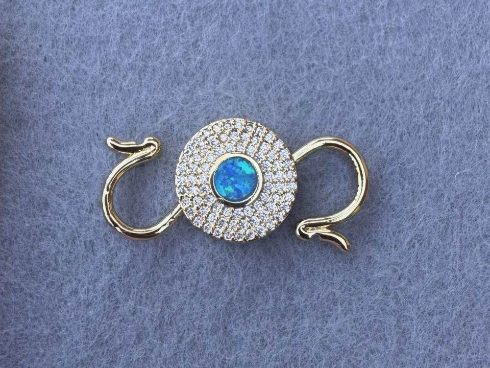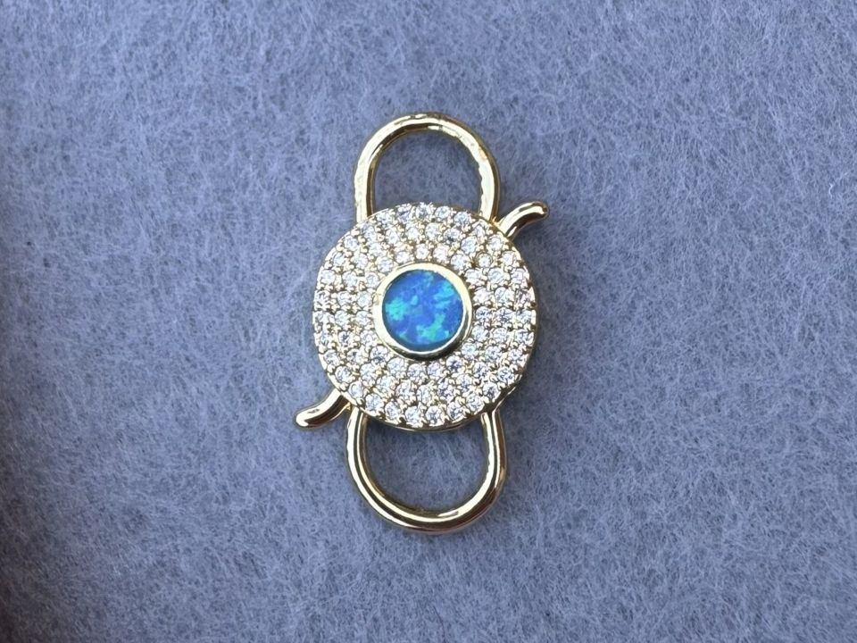 Родований замочок для біжутерії "Карабін", з інкрустацією фіанітами та вставкою опала. Розмір: 26*15 мм. Колір золото. Якісна фурнітура класу Люкс. Ціна вказана на одну штуку. Вона надійно фіксує масивне кольє з ланцюгів або намисто з натурального каміння. Застібка карабін ідеально підійде для створення прикрас на шию.