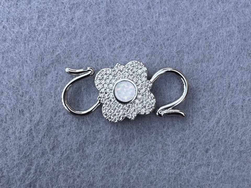 Родований замочок для біжутерії "Карабін", з інкрустацією фіанітами та вставкою опала. Розмір: 26*17 мм. Колір-сталь. Якісна фурнітура класу Люкс. Ціна вказана на одну штуку. Вона надійно фіксує масивне кольє з ланцюгів або намисто з натурального каміння. Застібка карабін ідеально підійде для створення прикрас на шию.