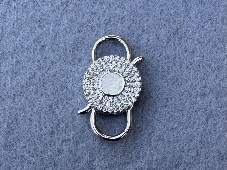 Родований замочок для біжутерії "Карабін", з інкрустацією фіанітами та вставкою опала. Розмір: 26*15 мм. Колір-сталь. Якісна фурнітура класу Люкс. Ціна вказана на одну штуку. Вона надійно фіксує масивне кольє з ланцюгів або намисто з натурального каміння. Застібка карабін ідеально підійде для створення прикрас на шию.