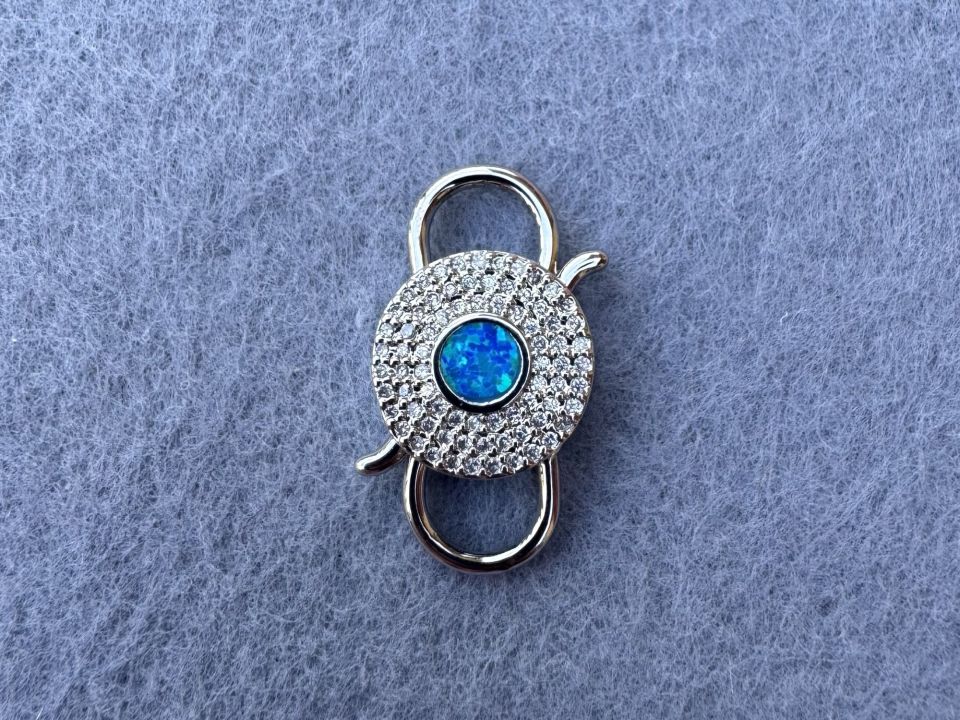 Родований замочок для біжутерії "Карабін", з інкрустацією фіанітами та вставкою опала. Розмір: 26*15 мм. Колір-сталь. Якісна фурнітура класу Люкс. Ціна вказана на одну штуку. Вона надійно фіксує масивне кольє з ланцюгів або намисто з натурального каміння. Застібка карабін ідеально підійде для створення прикрас на шию.