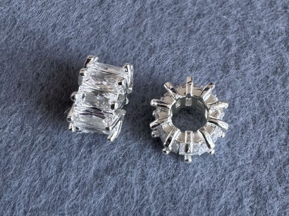 Намистини-ронделі інкрустовані Кубічним цирконієм (також називаються намистами з фіанітами). Покриття родій Колір-срібло. Діаметр: 11мм, ширина-6мм, отвір-5мм. Ціна за 1 шт