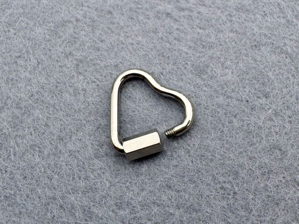 Замок для біжутерії "Серце". Розмір: 19*17 мм. Зроблений із нержавіючої сталі. Ціна вказана на одну штуку. Застібка, що закручується, - незамінна фурнітура для важких прикрас. Вона надійно фіксує масивне кольє з ланцюгів або намисто з натурального каміння. Застібка карабін ідеально підійде для створення прикрас на шию. Застібка з металу, що закручується, використовується не тільки для біжутерії, але і при виготовленні брелоків, сумок і як декоративний елемент.