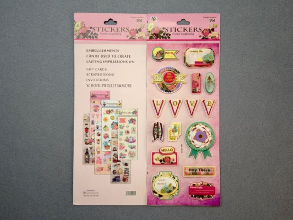 Набір різнокольорових 3D стікерів розміром 11*29 см. Прекрасно підійде для оформлення робіт у техніці скрапбукінгу: тематичних альбомів, скрап-сторінок, подарунків, фоторамок або листівок. Стікери мають різний дизайн, виготовлені з тонкого картону, закріплені клейовою подушечкою на наклейці-основі, достатньо відклеїти наклейку від листа та розмістити на своїй роботі. Ваша робота набуде нових барвистих акцентів. Ціна за 1 уп