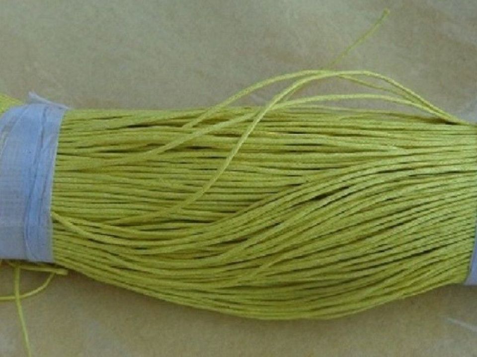 Шнур вощений - це міцний плетений бавовняний шнур, просочений воском для простоти нанизування, але це також робить шнур міцним. Універсальний засіб для складання авторських прикрас, бус, браслетів, брелків. Ціна за моток ~ 450 метрів. Колір жовтий.