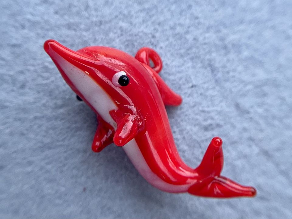 Скляна підвіска-кулон у формі дельфіна, ручної роботи. Виконана в техніці Лемпворк (Lampwork). Розмір: 2*4,5см. Може використовуватися як підвіска на браслети або кулон на шнурок для шиї. Ціна за шт.