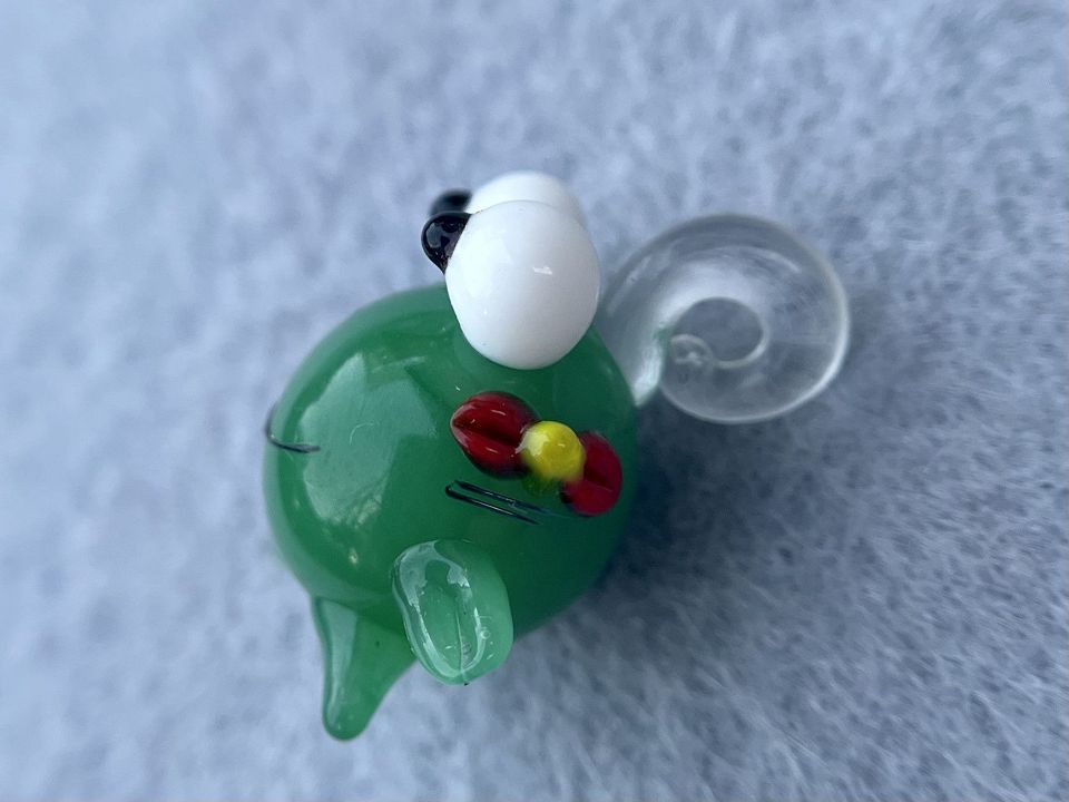 Скляна підвіска-кулон у формі жаби, ручної роботи. Виконана в техніці Лемпворк (Lampwork). Розмір: 2,5 * 2,5см. Може використовуватися як підвіска на браслети або кулон на шнурок для шиї. Ціна за шт.