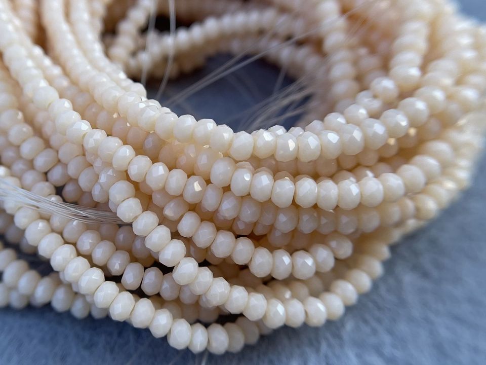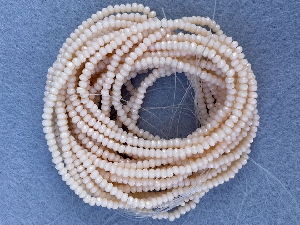 Кришталеві намистини, грановані. Розмір: 2*3мм, отвір: 1 мм. Форма: рондель, сфера. У нитці: 160+-3шт. Ціна за 1 нитку. Колір-бежевий напівпрозорий.