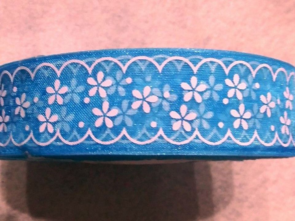 Стрічка з органзи з малюнком "Квітка невеликий", ширина-2.5см. В мотку-46 метрів. Використовуються при будь-яких видах декорування (при виготовленні сувенірів, ляльок, шпильок, гумок, обручів; при упаковці подарунків) .Ленти з органзи вдають із себе тонкі, трохи жорстким і напівпрозорі тканини смужки.