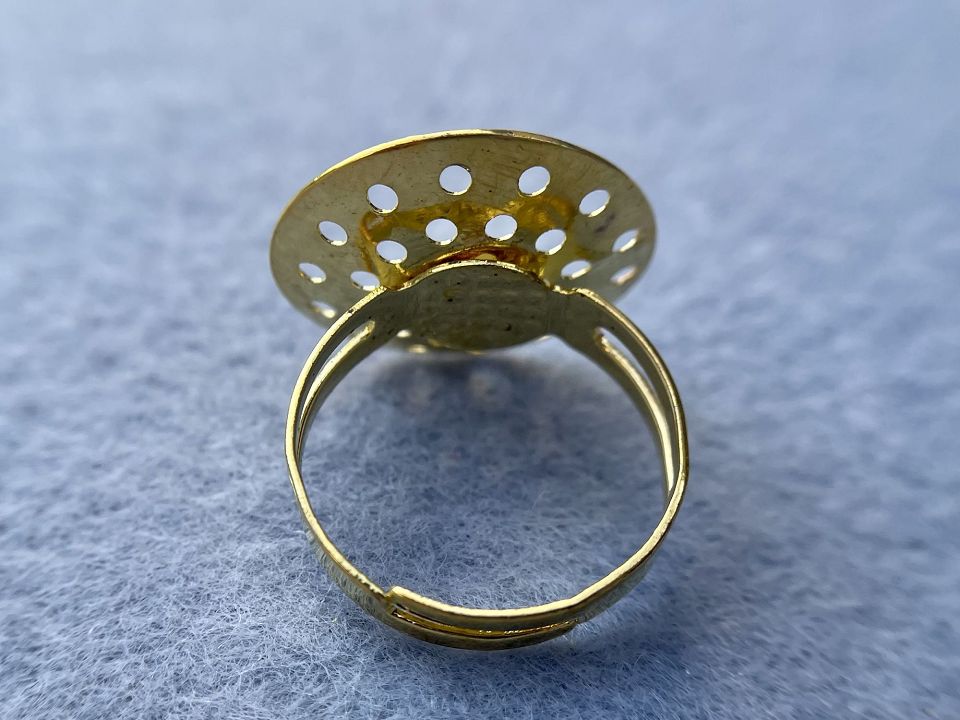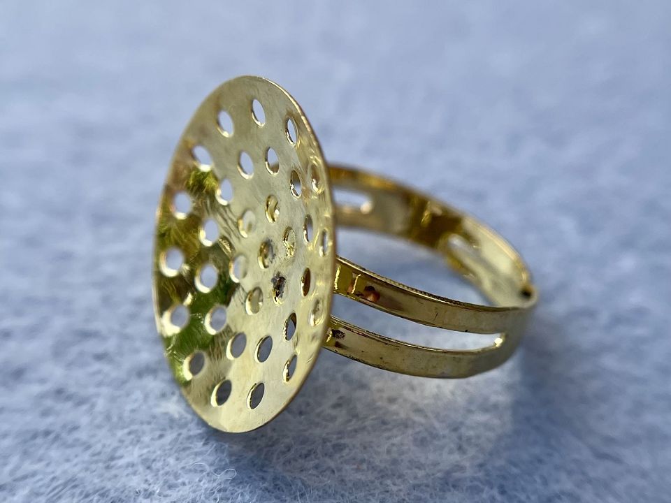 Основа для кільця з металевого сплаву, з основою -сіточка. Основа-20 мм. Діаметр кільця: 17мм і розширюється на пару розмірів. Колір:золото, ціна за 1шт.