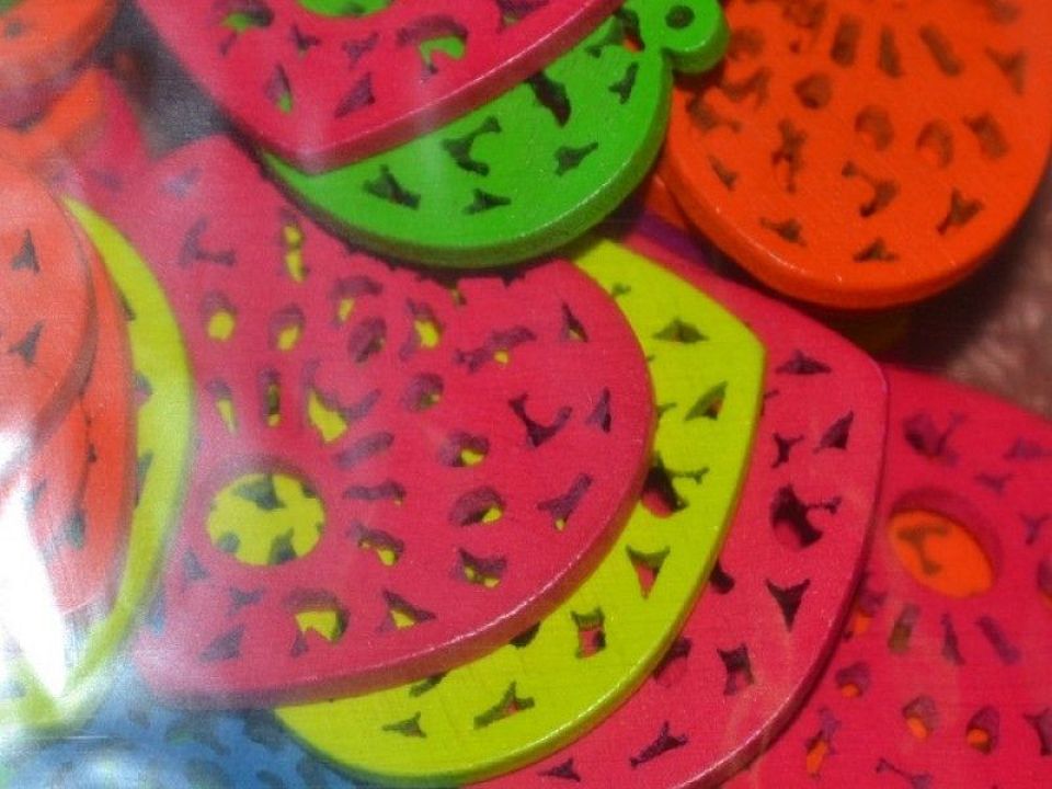Підвіски дерев'яні пофарбовані. Ціна за упаковку -100 шт. Розмір: 2,5-3 см, товщина: 1,5-2 мм. Колір-асорті. Може використовуватися як підвіски для браслетів, як кулон на шию або для виготовлення сережок. Також можна легко приклеїти або пришити, підійде для декорування речей і скрапбукінгу.